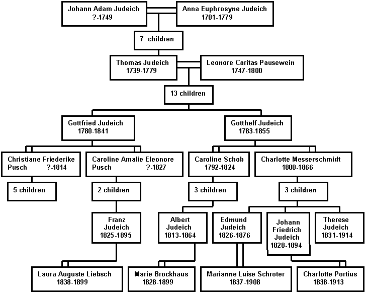 The family's history begins in the 18th century in Insterburg. JOHANN ADAM JUDEICH (?-1749) and ANNA EUPHROSYNE (1701-1779) are the first known ancestors of the Judeich family. They had seven children. All of them left Insterburg for Kaliningrad (modern day Russia), except for one of their sons, THOMAS JUDEICH (1739-1787) who settled in Dresden (Germany) and worked as a locksmith. He was the only one who passed the name Judeich on to the next generation. For the next hundred years Dresden and the area around Dresden will become the center of the family's history. It was in Dresden where the economic and social rise of the family began. THOMAS JUDEICH married LEONORE PAUSEWEIN. They had 13 children. Two of their sons shaped the family's history to a great extent: GOTTFRIED and GOTTHELF JUDEICH.
