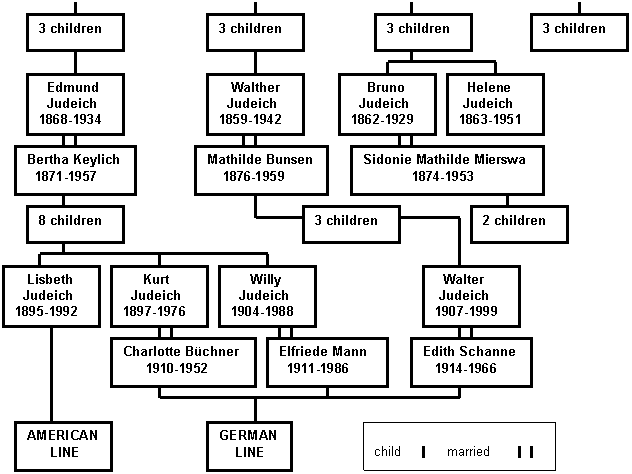 The story of the children of Gotthelf's children was a success as well. PROFESSOR WALTHER JUDEICH (1859-1942) attained worldwide acknowledgment for his scientific work of Greek history and his book "Topography of Athens". He married MATHILDE BUNSEN, the niece of the inventor of the Bunsen burner. BRUNO JUDEICH (1862-1929) became a journalist and married SIDONIE JUDEICH-MIERSWA who was an author of woman novels. Aside from being a teacher, HELENE JUDEICH (1863-1951) became a writer as well.